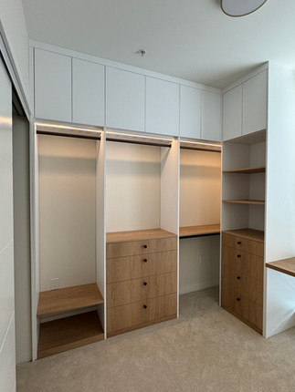 上方吊櫃收納季節性物品,吊衣區讓日常衣物一目了然,抽屜區讓小物分類更清楚,而開放層架則兼具展示與隨手放置的便利,讓收納變得更直覺,也讓生活跟著輕鬆起來。