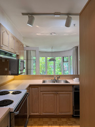 🔸廚房呈U型布局,與餐廳之間以半高隔牆劃分,阻隔了部分空間感。雖然前方有大片窗戶引入自然光,但整體氛圍依然略顯沉悶。
